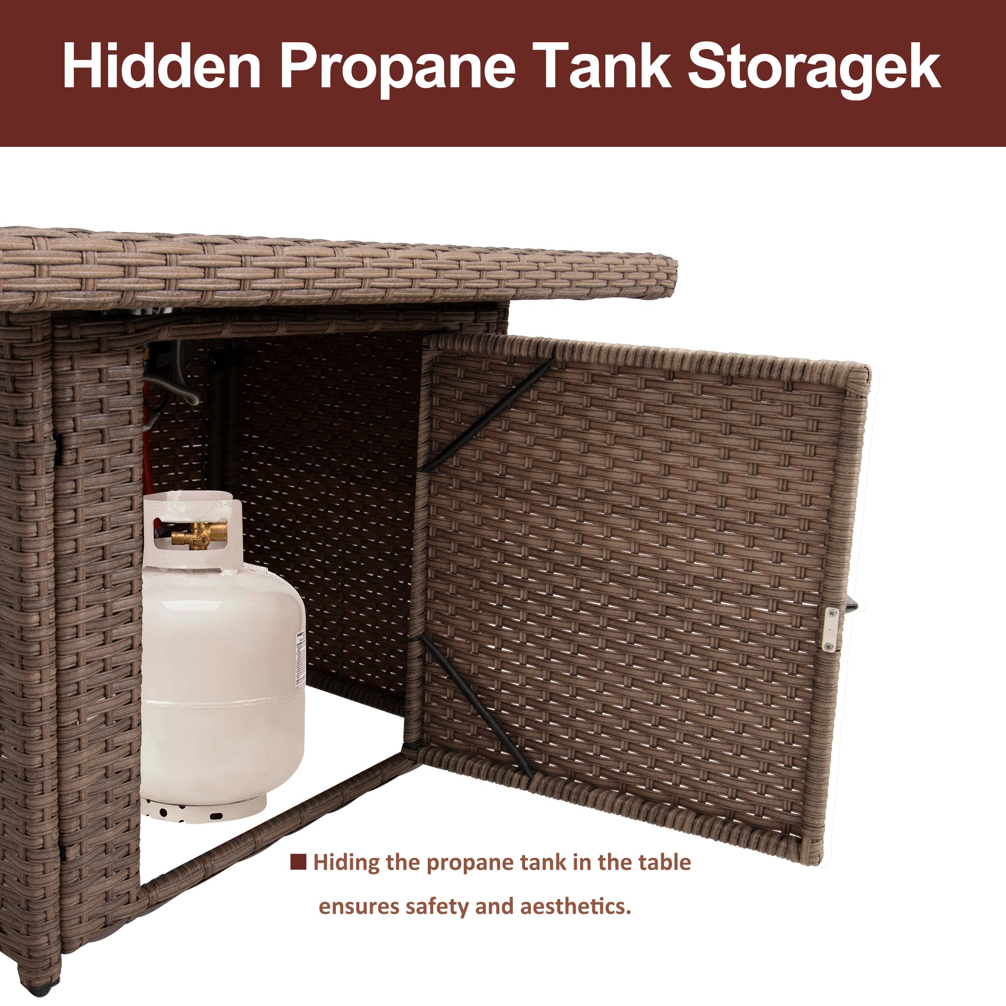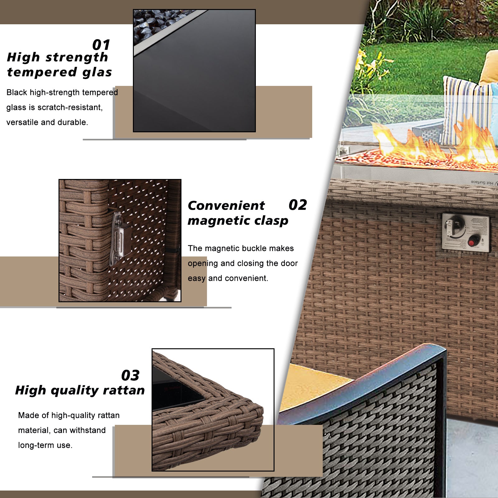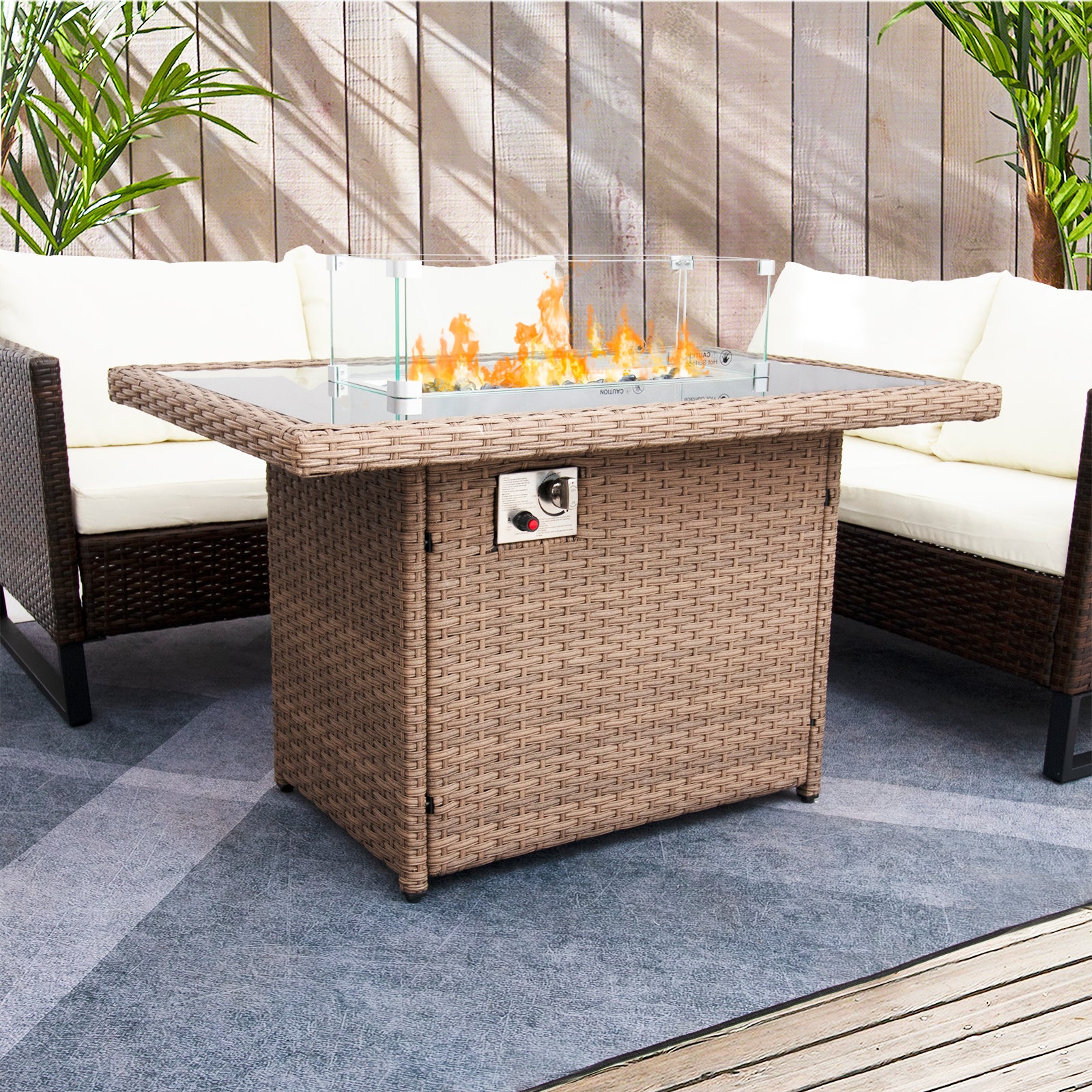 - New Fashion Design: The perfect combination of table and fire pit on your patio or in the backyard, with a beautiful wicker design and aluminum tabletop. This style combining beauty and practicality, you can enjoy coffee with friends while warming yourself by a fire.