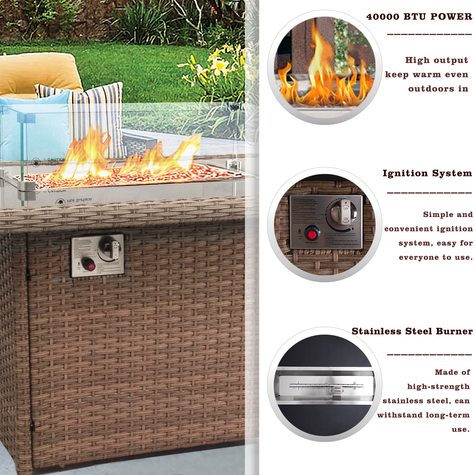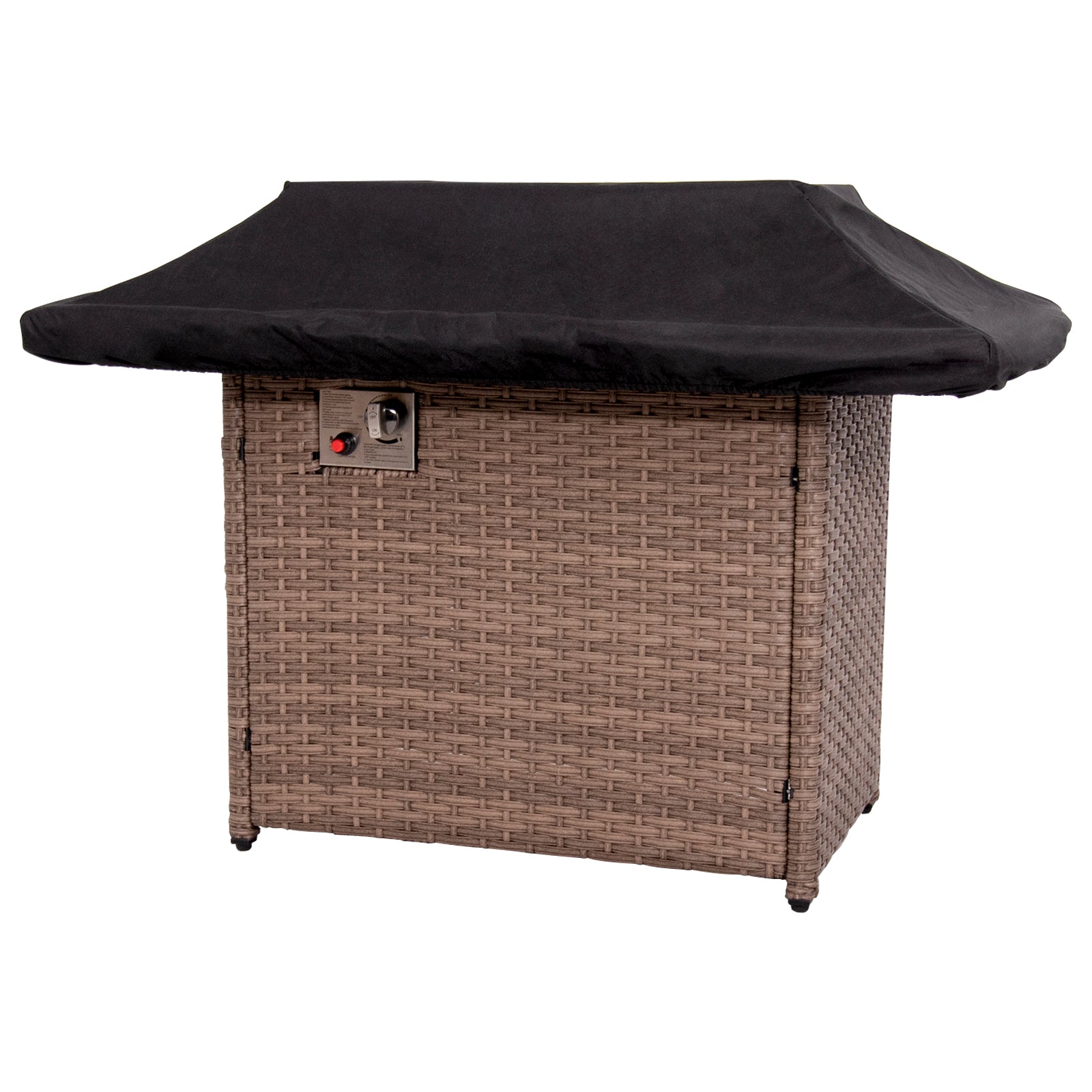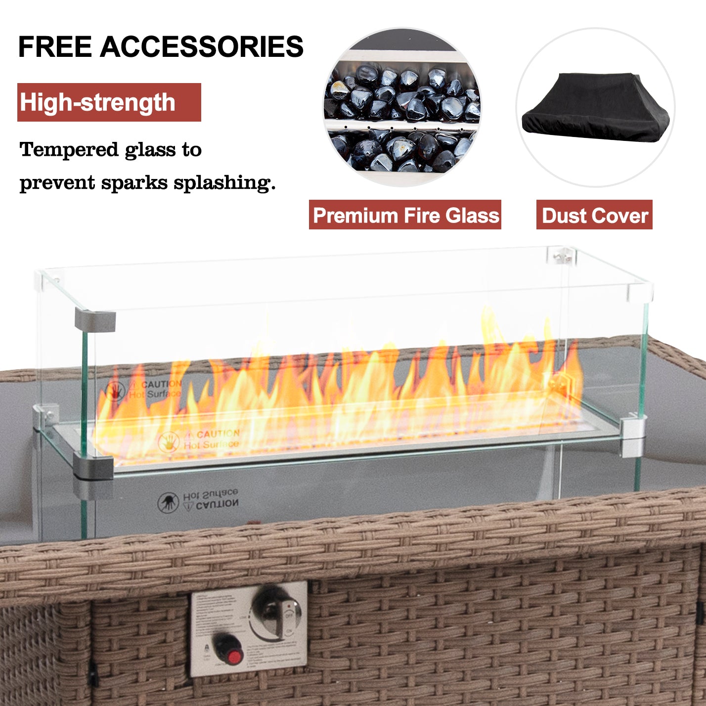 - SIZE & Configuration: Overall Fireplace Table dimensions: 27.6in x 43.3in. This fire pit table includes: hose with regulator, aluminum frame and a durable fabric cover. The firepit table provide over 50,000 BTU of heat output, and the product uses propane gas as fuel for clean burning without worrying about ashes and smoke.